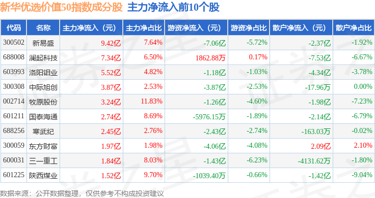 资金流向方面,新华优选价值50(989004)指数成份股当日主力资金净流出合计38.11亿元,游资资金净流出合计24.98亿元,散户资金净流入合计63.09亿元。成份股资金流向详情见下表: