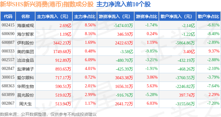 资金流向方面,新华SHS新兴消费(港币)(989007)指数成份股当日主力资金净流出合计14.3亿元,游资资金净流入合计1984.84万元,散户资金净流入合计14.11亿元。成份股资金流向详情见下表: