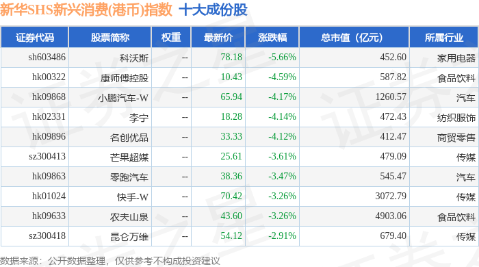 新华SHS新兴消费(港币)(989007)指数十大成份股详情如下: