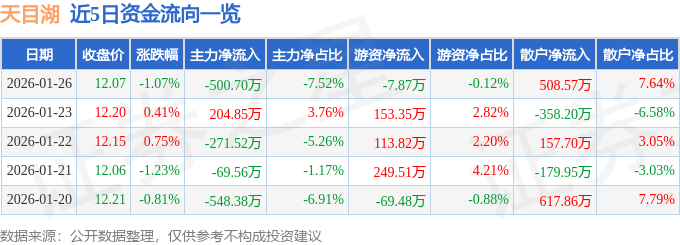 证券之星消息,截至2026年1月26日收盘,天目湖(603136)报收于12.07元,下跌1.07%,换手率2.05%,成交量5.53万手,成交额6660.12万元。
