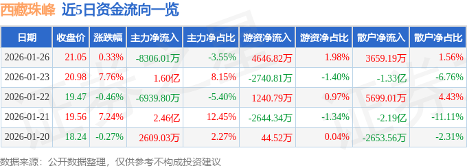 证券之星消息,截至2026年1月26日收盘,西藏珠峰(600338)报收于21.05元,上涨0.33%,换手率12.0%,成交量109.66万手,成交额23.42亿元。