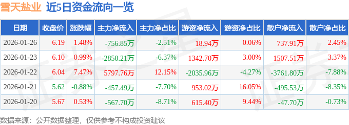 证券之星消息,截至2026年1月26日收盘,雪天盐业(600929)报收于6.19元,上涨1.48%,换手率2.97%,成交量48.74万手,成交额3.01亿元。