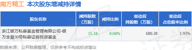 证券之星消息,1月26日南方精工发布公告《南方精工:江苏南方精工股份有限公司简式权益变动报告书》,其股东浙江银万私募基金管理有限公司-银万全盈30号私募证券投资基金于2026年1月22日至2026年1月26日间合计减持15.34万股,占公司目前总股本的0.0434%,变动期间该股股价上涨4.59%,截止1月26日收盘报29.65元。