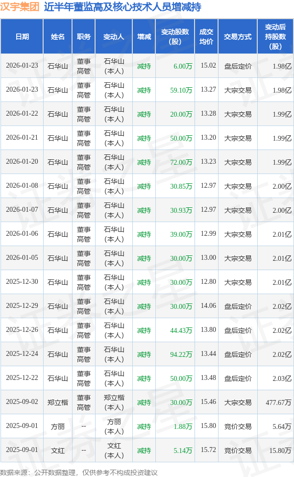 汉宇集团近半年内的董监高及核心技术人员增减持详情如下: