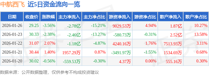 证券之星消息,截至2026年1月26日收盘,中航西飞(000768)报收于29.25元,下跌3.56%,换手率2.22%,成交量61.43万手,成交额18.26亿元。
