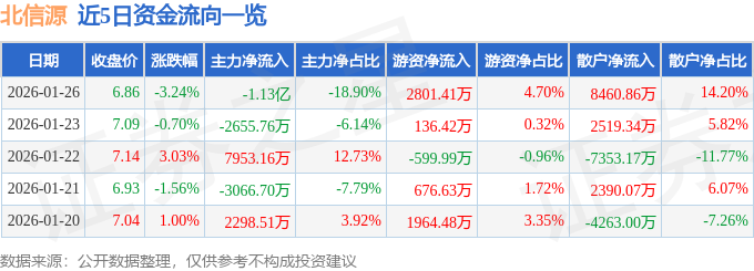 证券之星消息,截至2026年1月26日收盘,北信源(300352)报收于6.86元,下跌3.24%,换手率6.8%,成交量86.85万手,成交额5.96亿元。