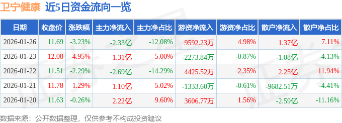 证券之星消息,截至2026年1月26日收盘,卫宁健康(300253)报收于11.69元,下跌3.23%,换手率9.04%,成交量165.02万手,成交额19.28亿元。