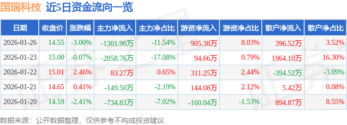 证券之星消息,截至2026年1月26日收盘,国瑞科技(300600)报收于14.55元,下跌3.0%,换手率2.61%,成交量7.69万手,成交额1.13亿元。