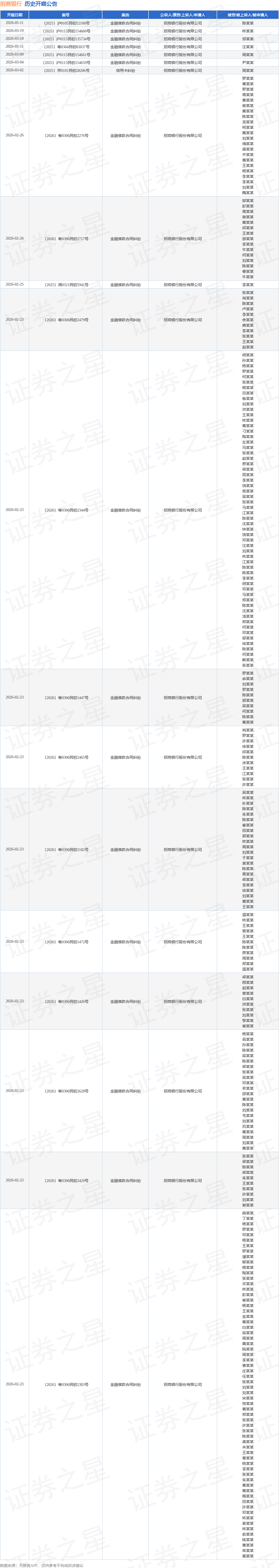 案号:(2025)粤0304民初83037号根据统计,近一年内以招商银行股份有限公司为当事人的历史开庭公告有905则,其中案由为“信用卡纠纷”的公告以458则居首,其次为“金融借款合同纠纷”有375则,“借款合同纠纷”有36则。历史开庭公告(前20条)如下: