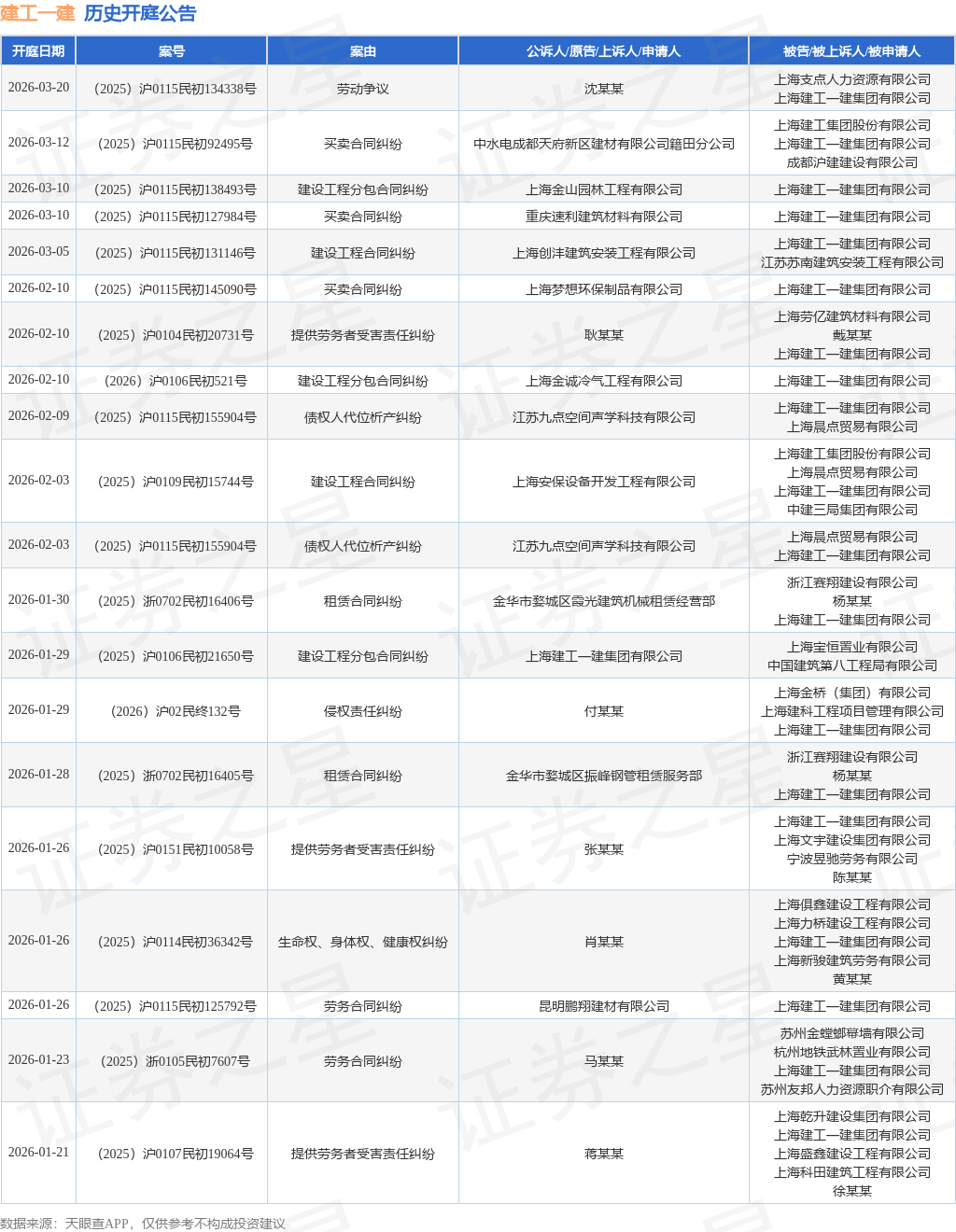 案号:(2026)沪02民终132号根据统计,近一年内以上海建工一建集团有限公司为当事人的历史开庭公告有285则,其中案由为“买卖合同纠纷”的公告以79则居首,其次为“建设工程施工合同纠纷”有36则,“建设工程分包合同纠纷”有31则。历史开庭公告(前20条)如下: