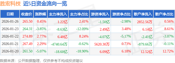 证券之星消息,截至2026年1月26日收盘,胜宏科技(300476)报收于265.5元,上涨0.45%,换手率2.21%,成交量18.93万手,成交额50.53亿元。