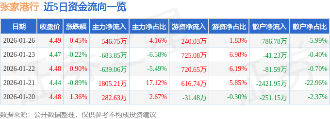 证券之星消息,截至2026年1月26日收盘,张家港行(002839)报收于4.49元,上涨0.45%,换手率1.2%,成交量29.32万手,成交额1.31亿元。