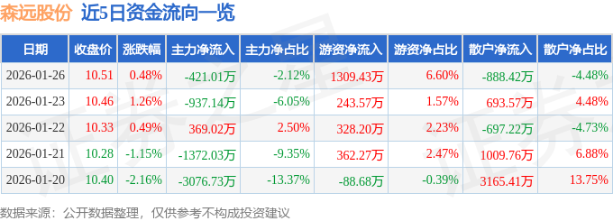 证券之星消息,截至2026年1月26日收盘,森远股份(300210)报收于10.51元,上涨0.48%,换手率3.92%,成交量18.96万手,成交额1.98亿元。