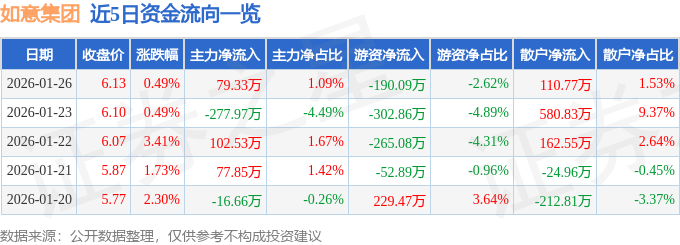 证券之星消息,截至2026年1月26日收盘,如意集团(002193)报收于6.13元,上涨0.49%,换手率4.56%,成交量11.93万手,成交额7262.8万元。