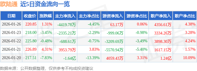 证券之星消息,截至2026年1月26日收盘,欧陆通(300870)报收于220.85元,上涨1.31%,换手率4.08%,成交量4.48万手,成交额9.94亿元。