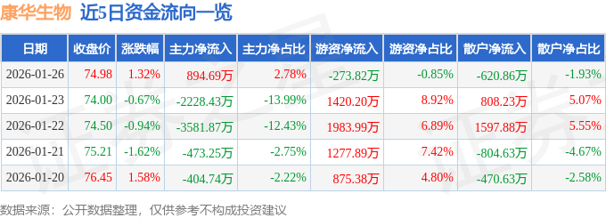 证券之星消息,截至2026年1月26日收盘,康华生物(300841)报收于74.98元,上涨1.32%,换手率3.68%,成交量4.37万手,成交额3.22亿元。