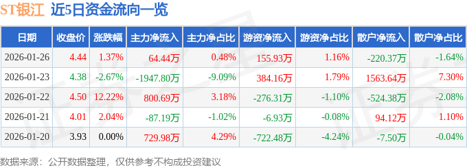 证券之星消息,截至2026年1月26日收盘,ST银江(300020)报收于4.44元,上涨1.37%,换手率3.94%,成交量30.2万手,成交额1.34亿元。