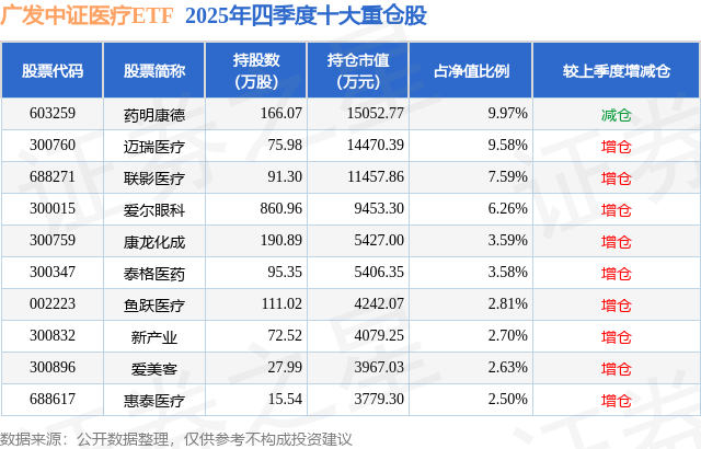 广发中证医疗ETF基金成立于2023年9月6日,基金经理为霍华明,基金跟踪标的为中证医疗指数,成立以来超额回报为3.6%,近一个月超额回报为0.01%。最新披露的基金持仓数据显示,截止2025年12月31日,该基金第一大重仓股为药明康德(603259),持股占比为9.97%。