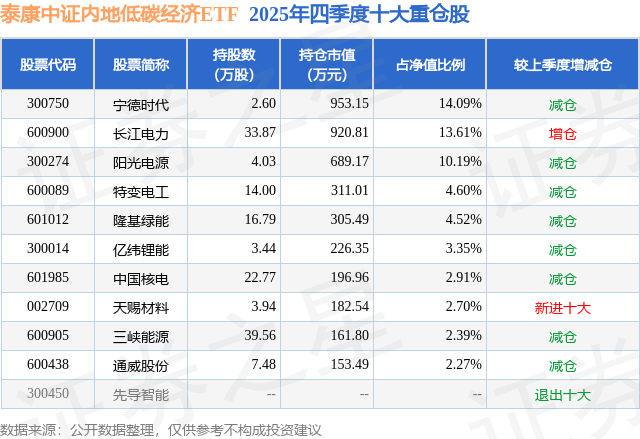 泰康中证内地低碳经济ETF基金成立于2021年8月27日,基金经理为魏军,基金跟踪标的为中证内地低碳经济主题指数,成立以来超额回报为1.56%,近一个月超额回报为-0.11%。最新披露的基金持仓数据显示,截止2025年12月31日,该基金第一大重仓股为宁德时代(300750),持股占比为14.09%。