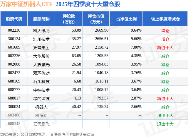 万家中证机器人ETF基金成立于2025年3月19日,基金经理为贺方舟,基金跟踪标的为中证机器人指数,成立以来超额回报为10.14%,近一个月超额回报为-0.13%。最新披露的基金持仓数据显示,截止2025年12月31日,该基金第一大重仓股为科大讯飞(002230),持股占比为9.64%。