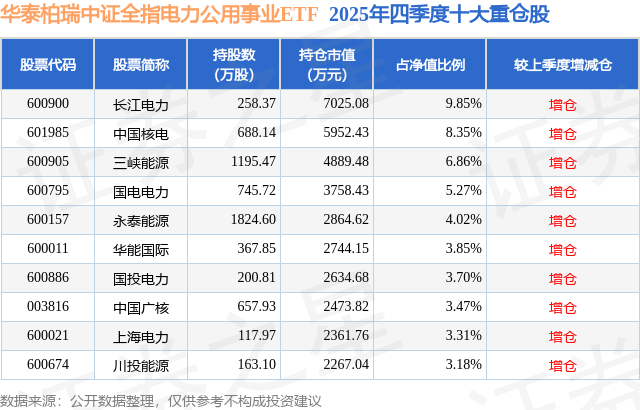 华泰柏瑞中证全指电力公用事业ETF基金成立于2022年4月26日,基金经理为尤家妤,基金跟踪标的为中证全指电力公用事业指数,成立以来超额回报为3.21%,近一个月超额回报为0.01%。最新披露的基金持仓数据显示,截止2025年12月31日,该基金第一大重仓股为长江电力(600900),持股占比为9.85%。