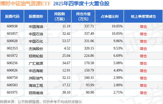 博时中证油气资源ETF基金成立于2024年4月19日,基金经理为王祥,基金跟踪标的为中证油气资源指数,成立以来超额回报为5.0%,近一个月超额回报为-0.58%。最新披露的基金持仓数据显示,截止2025年12月31日,该基金第一大重仓股为中国海油(600938),持股占比为10.05%。