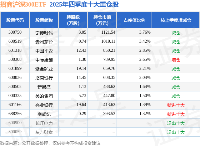 招商沪深300ETF基金成立于2024年9月6日,基金经理为房俊一,基金跟踪标的为沪深300指数,成立以来超额回报为10.32%,近一个月超额回报为0.22%。最新披露的基金持仓数据显示,截止2025年12月31日,该基金第一大重仓股为宁德时代(300750),持股占比为3.76%。