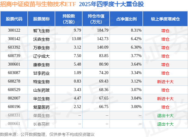 招商中证疫苗与生物技术ETF基金成立于2023年3月15日,基金经理为廖裕舟,基金跟踪标的为中证疫苗与生物技术指数,成立以来超额回报为3.65%,近一个月超额回报为-0.14%。最新披露的基金持仓数据显示,截止2025年12月31日,该基金第一大重仓股为智飞生物(300122),持股占比为8.31%。
