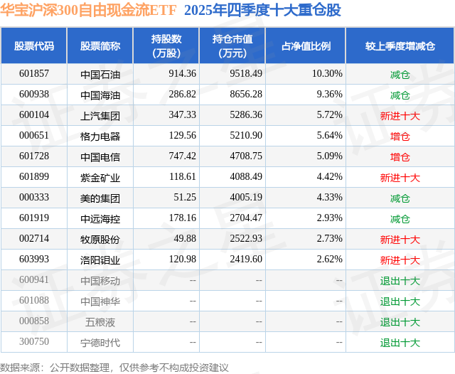 华宝沪深300自由现金流ETF基金成立于2025年4月7日,基金经理为胡一江,基金跟踪标的为沪深300自由现金流指数,成立以来超额回报为7.54%,近一个月超额回报为0.06%。最新披露的基金持仓数据显示,截止2025年12月31日,该基金第一大重仓股为中国石油(601857),持股占比为10.3%。