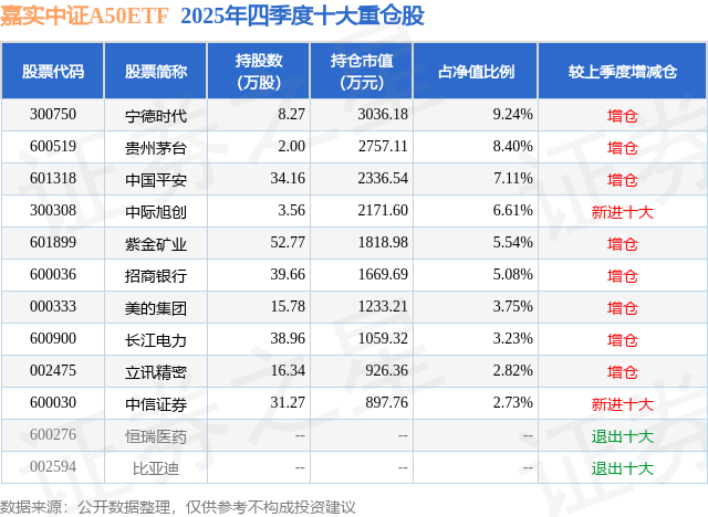 嘉实中证A50ETF基金成立于2024年3月7日,基金经理为尚可,基金跟踪标的为中证A50指数,成立以来超额回报为6.93%,近一个月超额回报为0.19%。最新披露的基金持仓数据显示,截止2025年12月31日,该基金第一大重仓股为宁德时代(300750),持股占比为9.24%。