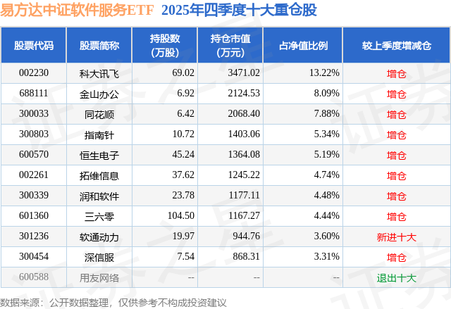易方达中证软件服务ETF基金成立于2023年5月22日,基金经理为伍臣东,基金跟踪标的为中证软件服务指数,成立以来超额回报为0.14%,近一个月超额回报为-0.05%。最新披露的基金持仓数据显示,截止2025年12月31日,该基金第一大重仓股为科大讯飞(002230),持股占比为13.22%。