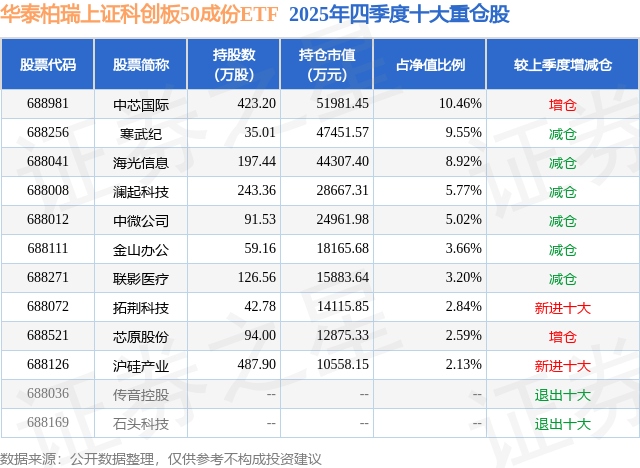 华泰柏瑞上证科创板50成份ETF基金成立于2020年9月28日,基金经理为柳军,基金跟踪标的为上证科创板50成份指数,成立以来超额回报为-2.23%,近一个月超额回报为-0.12%。最新披露的基金持仓数据显示,截止2025年12月31日,该基金第一大重仓股为中芯国际(688981),持股占比为10.46%。
