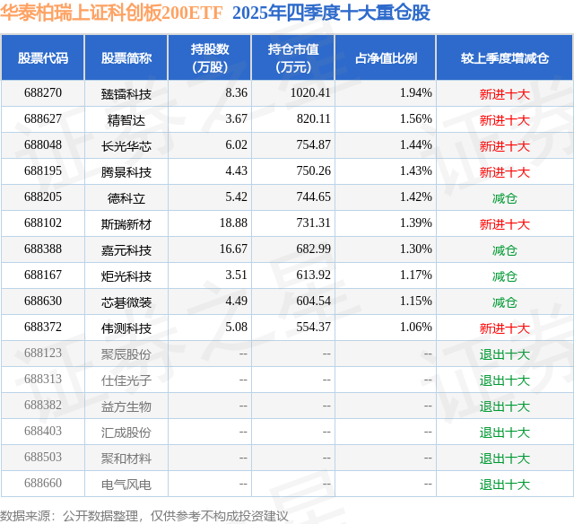 华泰柏瑞上证科创板200ETF基金成立于2024年12月16日,基金经理为李沐阳,基金跟踪标的为上证科创板200指数,成立以来超额回报为6.06%,近一个月超额回报为-0.09%。最新披露的基金持仓数据显示,截止2025年12月31日,该基金第一大重仓股为臻镭科技(688270),持股占比为1.94%。