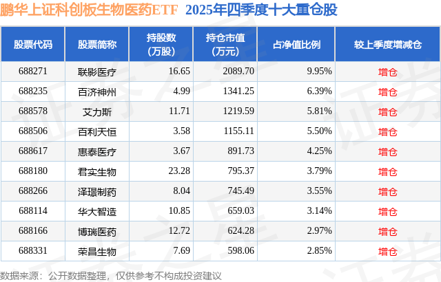 鹏华上证科创板生物医药ETF基金成立于2025年3月12日,基金经理为林嵩,基金跟踪标的为上证科创板生物医药指数,成立以来超额回报为-1.63%,近一个月超额回报为-0.1%。最新披露的基金持仓数据显示,截止2025年12月31日,该基金第一大重仓股为联影医疗(688271),持股占比为9.95%。