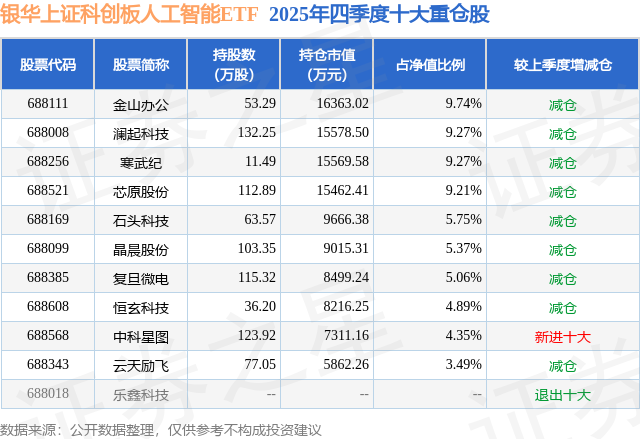 银华上证科创板人工智能ETF基金成立于2025年1月6日,基金经理为谭跃峰,基金跟踪标的为上证科创板人工智能指数,成立以来超额回报为-7.54%,近一个月超额回报为-0.33%。最新披露的基金持仓数据显示,截止2025年12月31日,该基金第一大重仓股为金山办公(688111),持股占比为9.74%。