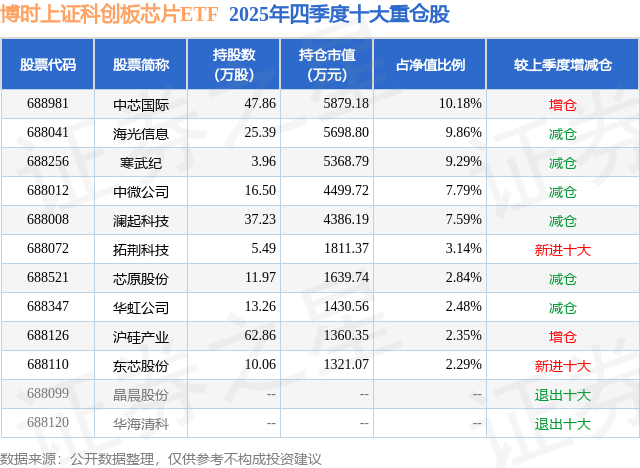 博时上证科创板芯片ETF基金成立于2024年8月8日,基金经理为李庆阳,基金跟踪标的为上证科创板芯片指数,成立以来超额回报为-11.21%,近一个月超额回报为-0.09%。最新披露的基金持仓数据显示,截止2025年12月31日,该基金第一大重仓股为中芯国际(688981),持股占比为10.18%。