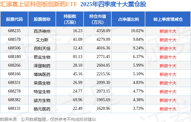 汇添富上证科创板创新药ETF基金成立于2025年9月10日,基金经理为罗昊,基金跟踪标的为上证科创板创新药指数,成立以来超额回报为0.0%,近一个月超额回报为-0.09%。最新披露的基金持仓数据显示,截止2025年12月31日,该基金第一大重仓股为百济神州(688235),持股占比为10.02%。