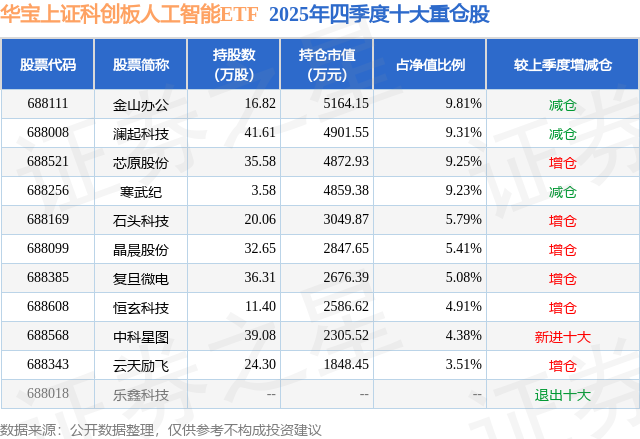 华宝上证科创板人工智能ETF基金成立于2025年3月5日,基金经理为丰晨成 曹旭辰,基金跟踪标的为上证科创板人工智能指数,成立以来超额回报为-4.78%,近一个月超额回报为-0.14%。最新披露的基金持仓数据显示,截止2025年12月31日,该基金第一大重仓股为金山办公(688111),持股占比为9.81%。