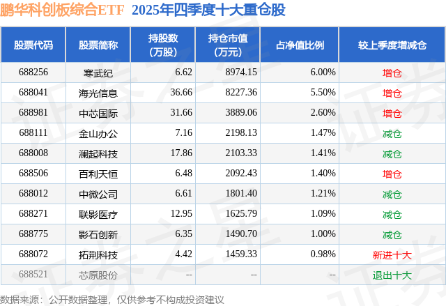 鹏华科创板综合ETF基金成立于2025年2月26日,基金经理为苏俊杰,基金跟踪标的为上证科创板综合指数,成立以来超额回报为-0.97%,近一个月超额回报为-0.44%。最新披露的基金持仓数据显示,截止2025年12月31日,该基金第一大重仓股为寒武纪(688256),持股占比为6.0%。