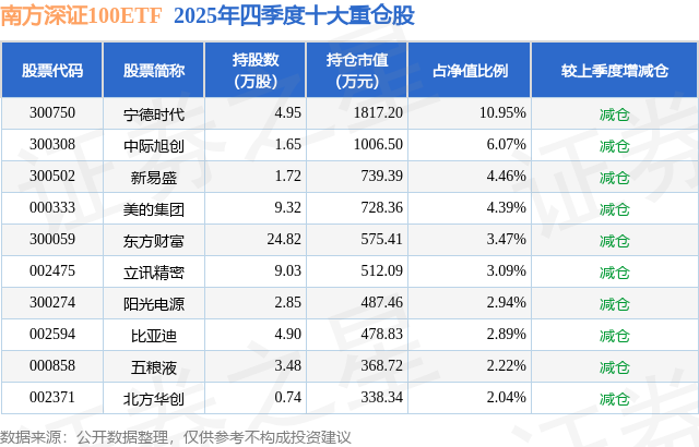 南方深证100ETF基金成立于2025年3月27日,基金经理为龚涛 赵卓雄,基金跟踪标的为深证100指数(价格),成立以来超额回报为14.7%,近一个月超额回报为0.04%。最新披露的基金持仓数据显示,截止2025年12月31日,该基金第一大重仓股为宁德时代(300750),持股占比为10.95%。