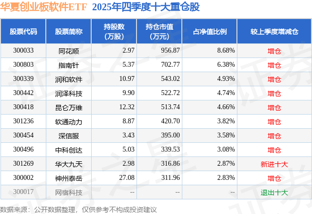 华夏创业板软件ETF基金成立于2025年7月24日,基金经理为单宽之,基金跟踪标的为创业板软件指数,成立以来超额回报为-2.21%,近一个月超额回报为-0.05%。最新披露的基金持仓数据显示,截止2025年12月31日,该基金第一大重仓股为同花顺(300033),持股占比为8.68%。