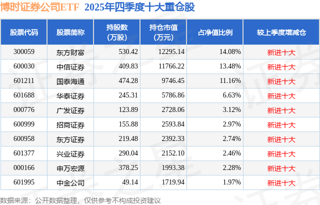博时证券公司ETF基金成立于2025年10月24日,基金经理为赵云阳,基金跟踪标的为中证全指证券公司指数,成立以来超额回报为-1.76%,近一个月超额回报为-0.03%。最新披露的基金持仓数据显示,截止2025年12月31日,该基金第一大重仓股为东方财富(300059),持股占比为14.08%。