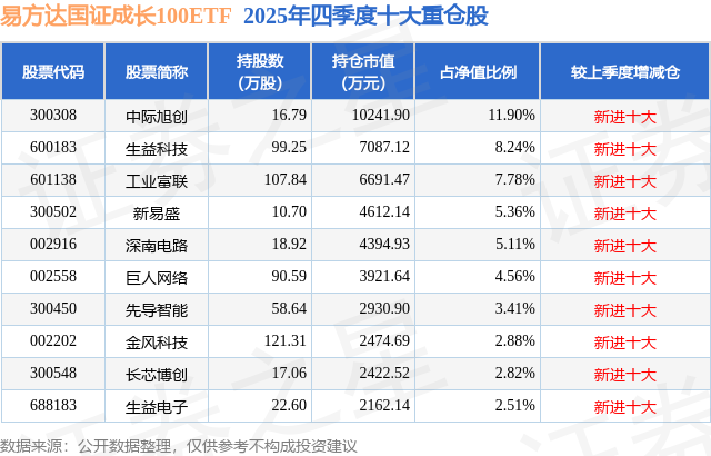 易方达国证成长100ETF基金成立于2025年8月20日,基金经理为李树建,基金跟踪标的为国证成长100指数,成立以来超额回报为-10.48%,近一个月超额回报为0.06%。最新披露的基金持仓数据显示,截止2025年12月31日,该基金第一大重仓股为中际旭创(300308),持股占比为11.9%。