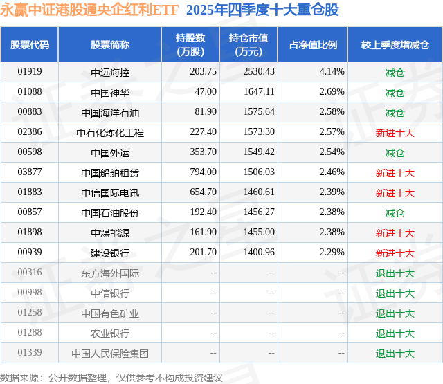 永赢中证港股通央企红利ETF基金成立于2025年7月23日,基金经理为刘庭宇 蔡路平,基金跟踪标的为中证港股通央企红利指数,成立以来超额回报为-0.46%,近一个月超额回报为-0.18%。最新披露的基金持仓数据显示,截止2025年12月31日,该基金第一大重仓股为中远海控(01919),持股占比为4.14%。