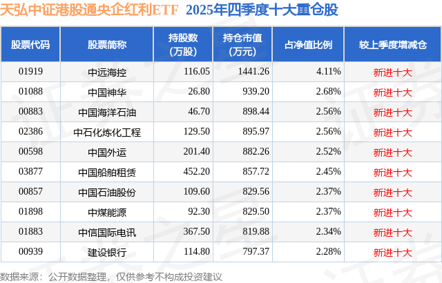 天弘中证港股通央企红利ETF基金成立于2025年8月20日,基金经理为贺雨轩,基金跟踪标的为中证港股通央企红利指数,成立以来超额回报为0.11%,近一个月超额回报为-0.18%。最新披露的基金持仓数据显示,截止2025年12月31日,该基金第一大重仓股为中远海控(01919),持股占比为4.11%。