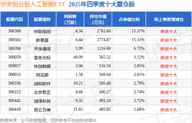 华安创业板人工智能ETF基金成立于2025年9月17日,基金经理为刘璇子,基金跟踪标的为创业板人工智能指数,成立以来超额回报为-1.43%,近一个月超额回报为-0.25%。最新披露的基金持仓数据显示,截止2025年12月31日,该基金第一大重仓股为中际旭创(300308),持股占比为15.37%。