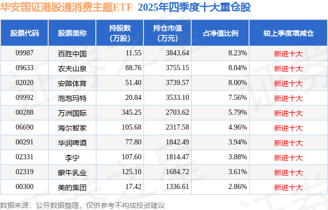 华安国证港股通消费主题ETF基金成立于2025年10月9日,基金经理为王超,基金跟踪标的为国证港股通消费主题指数,成立以来超额回报为-3.58%,近一个月超额回报为-2.17%。最新披露的基金持仓数据显示,截止2025年12月31日,该基金第一大重仓股为百胜中国(09987),持股占比为8.23%。