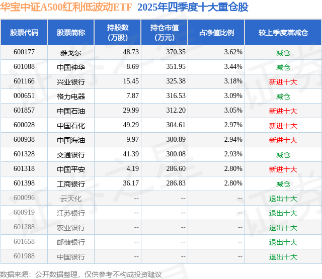华宝中证A500红利低波动ETF基金成立于2025年8月27日,基金经理为胡一江,基金跟踪标的为中证A500红利低波动指数,成立以来超额回报为2.75%,近一个月超额回报为0.18%。最新披露的基金持仓数据显示,截止2025年12月31日,该基金第一大重仓股为雅戈尔(600177),持股占比为3.62%。