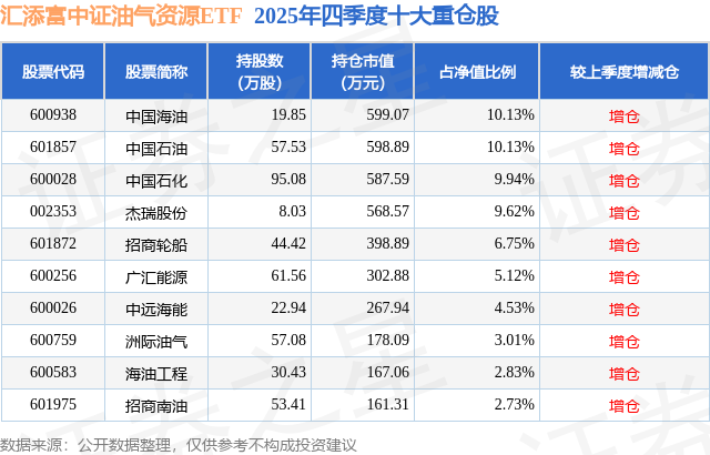 汇添富中证油气资源ETF基金成立于2024年5月31日,基金经理为晏阳,基金跟踪标的为中证油气资源指数,成立以来超额回报为8.38%,近一个月超额回报为-0.31%。最新披露的基金持仓数据显示,截止2025年12月31日,该基金第一大重仓股为中国海油(600938),持股占比为10.13%。