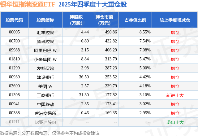 银华恒指港股通ETF基金成立于2024年6月13日,基金经理为李宜璇,基金跟踪标的为恒指港股通指数,成立以来超额回报为-9.69%,近一个月超额回报为-0.76%。最新披露的基金持仓数据显示,截止2025年12月31日,该基金第一大重仓股为汇丰控股(00005),持股占比为8.55%。